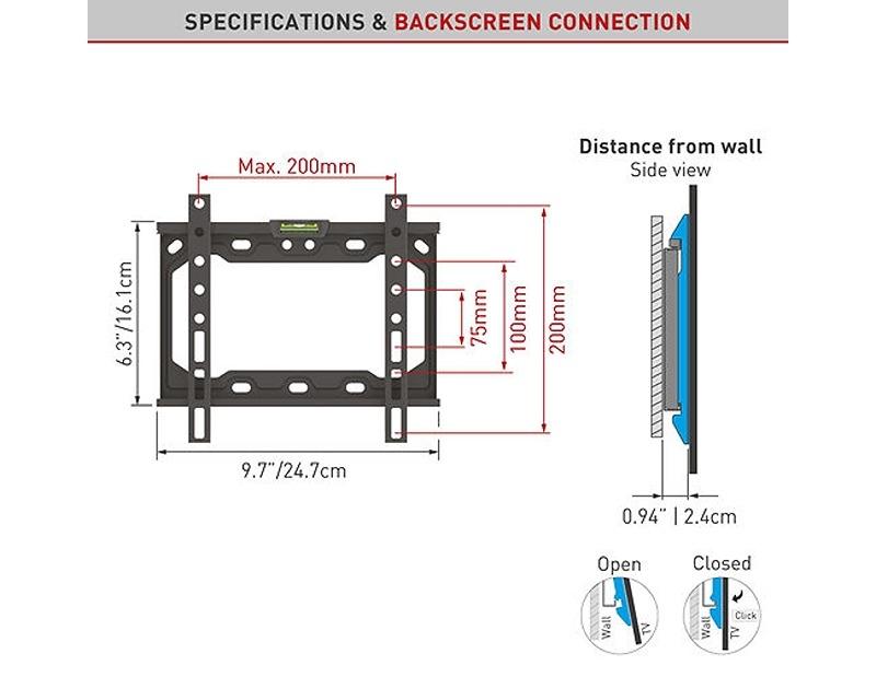 Karakteristike: | | Tip: Zidni nosač za televizor Montiranje: VESA 100mm x 100mm, VESA 100mm x 200mm, VESA 200mm x 100mm, VESA 200mm x 200mm, VESA 75mm x 75mm Podržane dijagonale: Do 43 inča Nosivost: 40kg Rastojanje od zida: 23mm - 240 Stanje: Nekorišćeno |