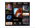 Ekran: | | Veličina ekrana: 85 inča (216cm) Rezolucija: 4K Ultra HD (3.840 x 2.160) Tip ekrana: ULED Tip panela: Mini LED Nativni kontrast: 5.000:1 Osvežavanje: 144Hz Odnos stranica: 16:9 Uglovi gledanja: 178 stepeni horizontalni, 178 stepeni vertikalni Ostalo: 4K HDR Immersive, Dolby Vision IQ, HDR, HDR10, HDR10+, HDR10+ Adaptive, HLG, MEMC, Quantum Dot tehnologija, Smanjivanje MPEG šuma |